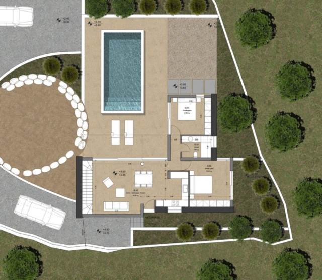 Στο δεύτερο επίπεδο Ένα άνετο υπνοδωμάτιο και μπάνιο Δυνατότητα ποιοτικής διαμονής και πρόσβασης για ΑΜΕΑ Άριστο φυσικό φωτισμό Κουφώματα αλουμινίου με διπλούς υαλοπίνακες Κλιματισμό Πέργκολα Θέση στάθμευσης Ιδιωτική πισίνα