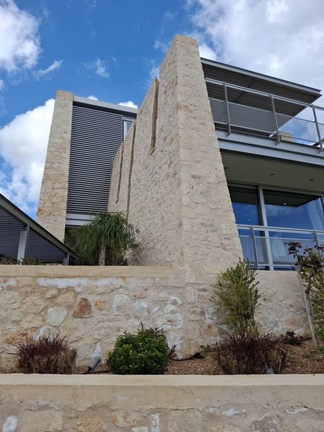 Την εν λόγω κατοικία χαρακτηρίζουν πέραν της εντυπωσιακής πετρόκτιστης τοιχοποιίας, οι χρωματισμοί σε γήινους τόνους που δημιουργούν ένα ιδιαίτερα φυσικό περιβάλλον, τα μεγάλα ανοίγματα οι άκρως λειτουργικοί χώροι στοιχεία τα οποία σε συνάρτηση με τις έντονα καλλιτεχνικές πινελιές του γνωστότατου αρχιτέκτονα που την έχει επιμεληθεί κοσμούν τη βίλα τόσο εσωτερικά όσο και εξωτερικά. Μεγάλη έμφαση έχει δοθεί στη δημιουργία καλά σχεδιασμένων εσωτερικών και εξωτερικών χώρων που συνδυάζουν την άνεση με την εργονομία - την λειτουργικότητα με την φινέτσα για μια όσο το δυνατόν πιο άνετη διαμονή