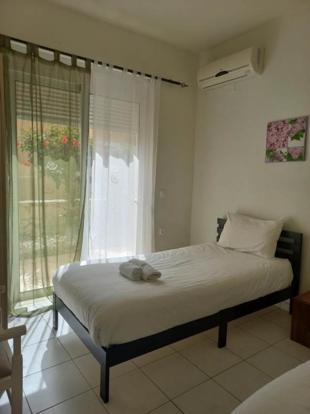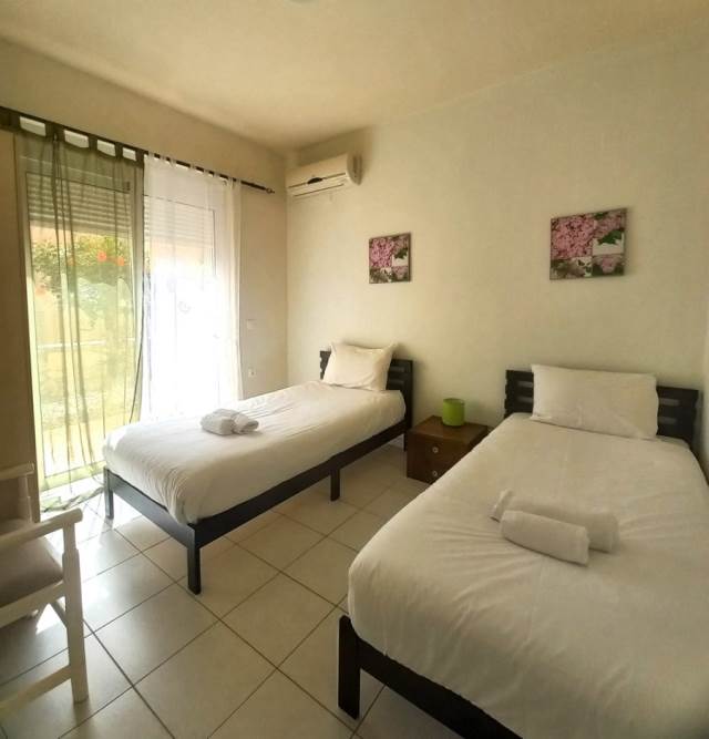 Nopigia – Mithimna In a short distance from the sea, for sale a maisonette with area of 65 m2, fully furnished and equipped, within a residential complex which is developed in beautifully landscaped common plot. The residence is developed on two levels and consists of: At the ground floor a spacious open plan space with a living room, dining room, kitchen with built-in electrical appliances, 1bedroom bathroom, comfortable terraces with direct access to the courtyard area and the communal pool. At the 1st floor there are 1 bedroom, a bathroom, and terraces with beautiful view of the surrounding area.It also has a solar water heater, air conditioning, complete equipment, and furniture.The exterior frames of the house are aluminum with double glazing. The floors are tiled. The surrounding area outside the residence offers fully landscaped common areas with stone arches, trees, and flowers. It is 100 meters from Nopigia Beach.
