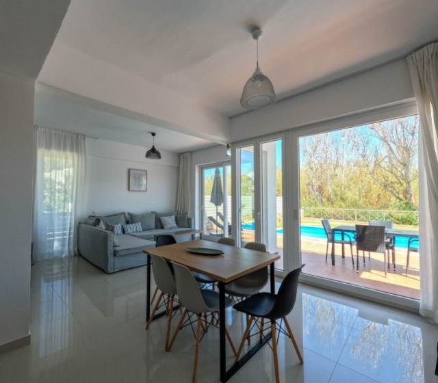 This residence is developed on two levels, which are connected via a staircase and consists of: On the first level, a spacious open plan area with a living room and a dining room, a functional kitchen with built-in electrical appliances, a wc, comfortable verandas, direct access to the courtyard and the swimming pool. On the second level, 2 comfortable bedrooms with built-in wardrobes, a large bathroom, comfortable balconies.