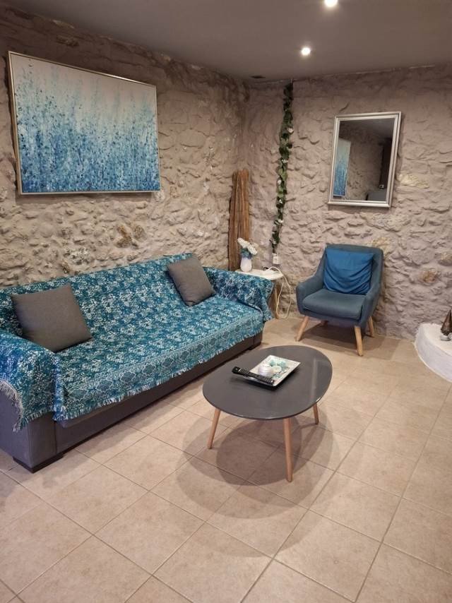 The house is developed on one level and consists of: A comfortable open plan area with a living room and a functional kitchen, 2 bedrooms, a bathroom, and a spacious covered terrace to enjoy moments of relaxation. Externally it is surrounded by a beautiful courtyard with trees and ornamental plants. It is ideally suited for people seeking tranquility, and can accomodate up to 2 persons.